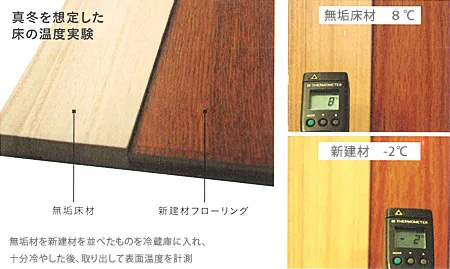 しかし、当社の天然無垢材は、空気層を含んでいるため断熱材の役目を果たし、