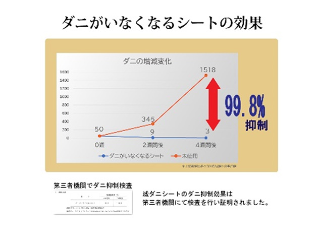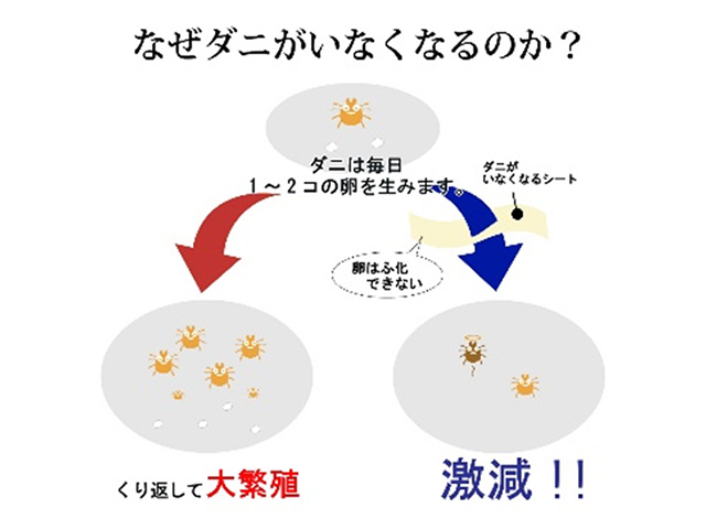 ダニを寄せ付けない防ダニ(忌避効果)ではなく、ダニそのものを増やさない、減らしていく機能をダニがもっとも生息・繁殖を繰り返すお布団に取り入れました。